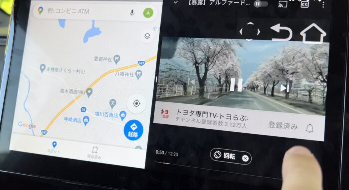 左側でGoogleマップ、右側でYouTubeなどが可能になります。TVキャンセラーなしで走行中でもこの状態ですので凄いですよね。